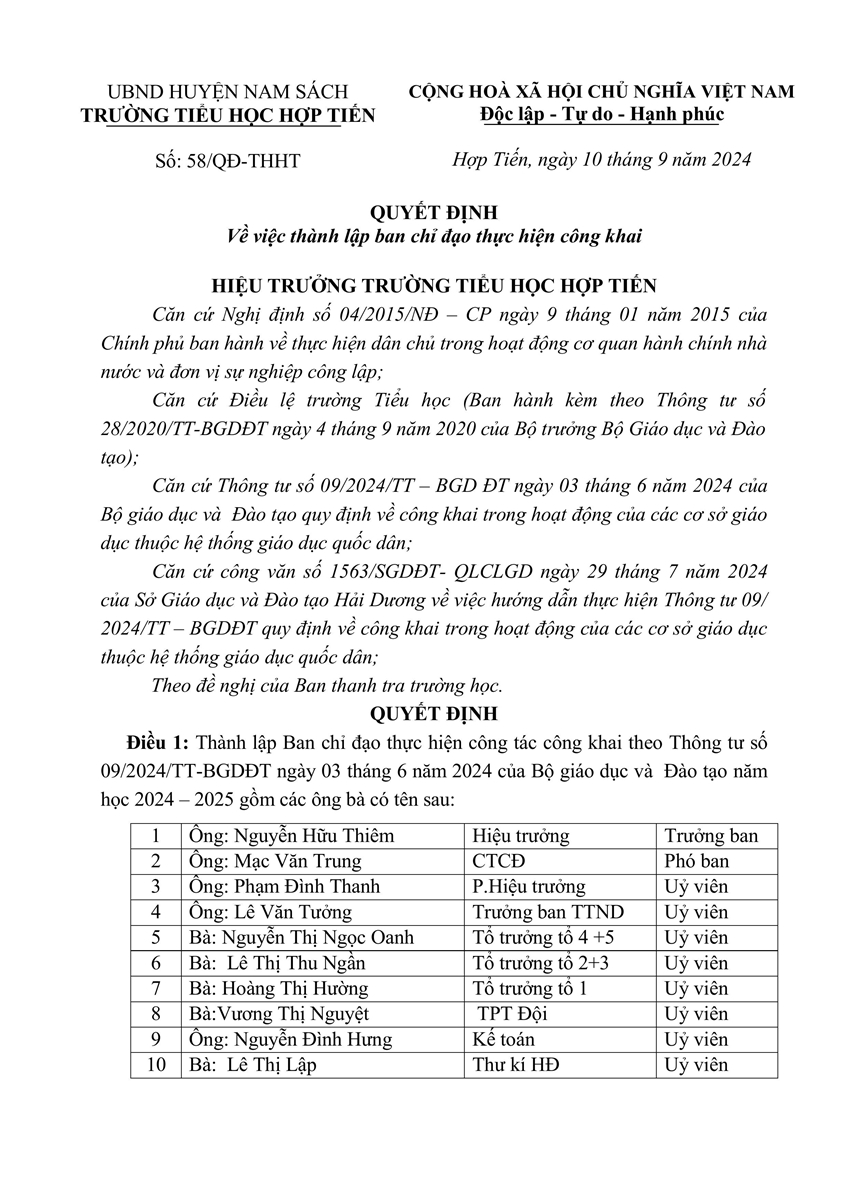 Trường Tiểu học Hợp Tiến - Nam Sách - Hải DƯơng công khai Quyết định thành lập BCĐ Công khai năm học 2024-2025 ...
